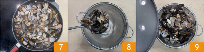 Wenn sich die Schalen geöffnet haben 7, die Schalentiere in ein Sieb geben 8 und den Kochsaft durch ein feines Sieb abgießen 9. Beiseitestellen.