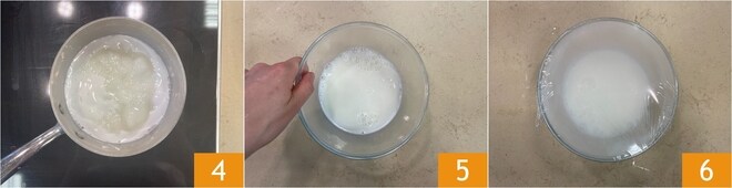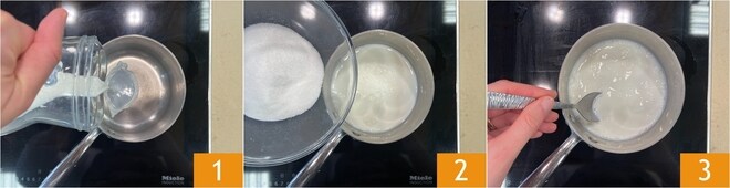 Bringen Sie die Mischung zum Kochen 4, bis der Zucker vollständig aufgelöst ist. Gießen Sie die Mischung in eine Schüssel 5 und lassen Sie sie zuerst auf Raumtemperatur und dann eine Stunde im Kühlschrank abkühlen 6.