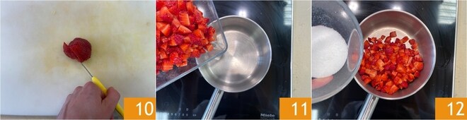 In der Zwischenzeit bereiten Sie das Erdbeer-Topping vor: Waschen Sie sie gut, entfernen Sie den grünen Teil und schneiden Sie sie in Würfel 10. Geben Sie sie in einen kleinen Topf und fügen Sie den Zucker hinzu 12.