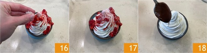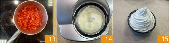 Kochen Sie die Mischung ein paar Minuten, bis sie weich sind 13, dann geben Sie sie in eine kleine Schüssel und stellen sie in den Kühlschrank. Wenn das Eis fertig und konsistent genug ist 14, können Sie es in kleine Schalen geben 15. Verwenden Sie einen Löffel oder einen Spritzbeutel, um die typische Form zu erhalten. In diesem Fall müssen Sie sehr schnell sein, da das Joghurt-Eis schmelzen könnte.