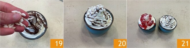 Garnieren Sie mit gepufftem Reis 19 und auch die zweite Version wird fertig sein 20! Das Frozen Yogurt ist bereit zum Servieren 21; wenn Sie es nicht sofort genießen möchten, stellen Sie das Eis in den Gefrierschrank und stellen Sie die Schalen dann zur gewünschten Zeit zusammen.