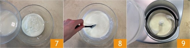 Sobald es kalt ist, fügen Sie den gezuckerten Milch dem Joghurt hinzu 7 und mischen Sie gut 8. Geben Sie die Mischung in eine Eismaschine, am besten selbstkühlend 9. Rühren Sie das Eis 30 Minuten oder länger, bis es die richtige Konsistenz erreicht hat.