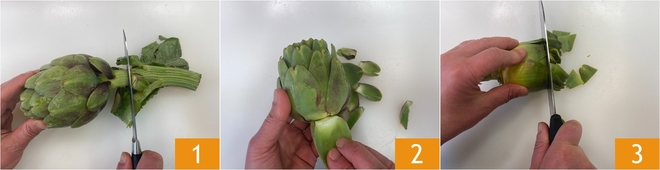 Um die mit Linsen gefüllten Artischocken zuzubereiten, beginnen Sie mit der Reinigung der Artischockenherzen: Den Stiel abtrennen 1 und die äußeren, härteren Blätter entfernen 2, dann die Spitze der Blätter abschneiden 3.