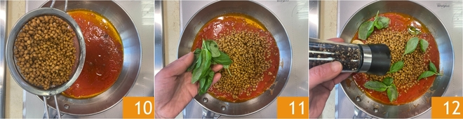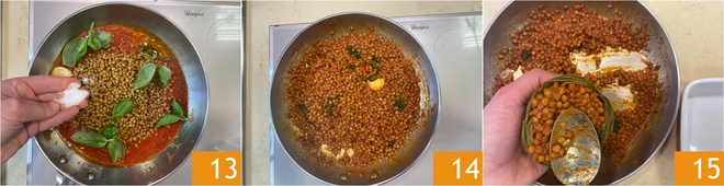 Fügen Sie die vorgekochten Linsen hinzu 10, duften Sie mit frischen Basilikumblättern 11 und pfeffern Sie 12.