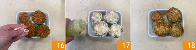 Legen Sie die gefüllten Artischocken in eine Auflaufform, dann bestreuen Sie die Oberfläche mit geriebenem Käse 16 und Semmelbröseln. Beträufeln Sie mit etwas Öl 17 und backen Sie in einem vorgeheizten statischen Ofen bei 180°C für 20 Minuten, dann weiter bei 200°C für 10 Minuten im Grillmodus. Herausnehmen und die mit Linsen gefüllten Artischocken abkühlen lassen, bevor Sie sie servieren 18!
