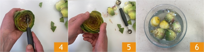 Höhlen Sie das Innere mit einem Messer oder einem Kugelausstecher aus 4, dann spreizen Sie die Blätter gut, um in der Mitte Platz für die Füllung zu schaffen 5. Während Sie die Artischocken reinigen, legen Sie sie in Wasser mit Zitrone, damit sie nicht dunkel werden 6.