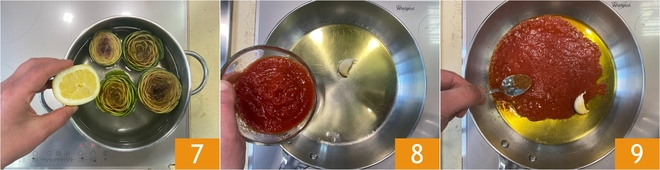 Nachdem Sie die Artischocken gereinigt haben, blanchieren Sie sie etwa 7 Minuten in Wasser mit Zitrone 7. Dann abtropfen lassen und beiseitestellen. In einer Pfanne erhitzen Sie etwas Öl mit einer Knoblauchzehe, dann gießen Sie das Tomatenpüree ein 8 und würzen nach Belieben mit Chili-Pulver 9.