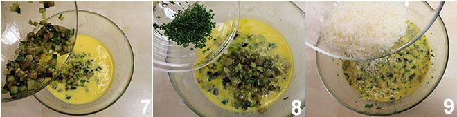 Nehmen Sie eine beschichtete Pfanne, erhitzen Sie 2/3 Esslöffel Öl 4 und braten Sie die in Würfel geschnittenen Zucchini und Aubergine für etwa 10 Minuten an 5. Nach dem Kochen abkühlen lassen. In einer Schüssel die geschlagenen Eier mit dem Ricotta vermischen 6.