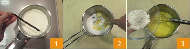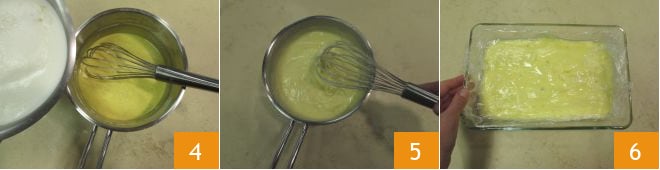Sobald Milch und Sahne heiß sind, entfernen Sie die Schote, gießen Sie die Mischung auf die Eigelbe 4 und rühren Sie gut um. Dann alles wieder auf schwache Hitze stellen, um die Creme einzudicken, und dabei umrühren, damit die Creme nicht am Boden klebt. Wenn die Creme dick ist, vom Herd nehmen und kräftig ein paar Sekunden rühren 5, dann die Creme in eine flache und breite Schüssel geben und mit Frischhaltefolie direkt auf der Creme abdecken 6. Zuerst bei Raumtemperatur und dann im Kühlschrank abkühlen lassen.