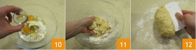 Den Anislikör 10 und eine Prise Salz hinzugeben. Alles zuerst mit einer Gabel und dann mit der Hand mischen 11. Den Teig auf eine leicht bemehlte Arbeitsfläche geben und mit einem Schaber bearbeiten 12.