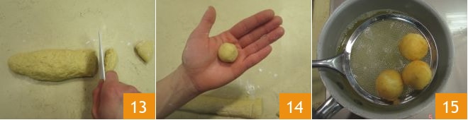 Eine Kugel formen und dann eine Rolle 13 daraus machen, aus der Sie etwa 20 g schwere Stückchen schneiden 14. Jedes Stück zu einer runden Form bringen 14, dann einige Kugeln gleichzeitig in heißem Erdnussöl bei 140° frittieren (mit einem Küchenthermometer messen) 15, bis sie goldbraun sind.