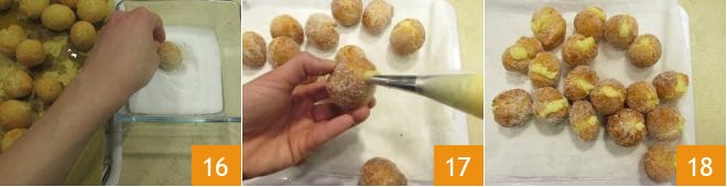 Auf saugfähigem Papier für Fettfrittiertes abtropfen lassen, um überschüssiges Öl zu entfernen. Noch heiß in Kristallzucker tauchen 16. Nun können Sie sie mit der Pudding-Creme füllen, die in einen Spritzbeutel mit sehr dünner Tülle gegeben wurde 17. Servieren Sie Ihre gefüllten Castagnole 18!
