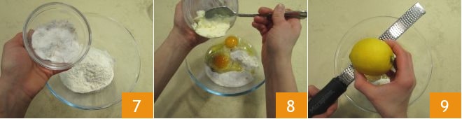 Widmen Sie sich dem Teig der Castagnole: In einer Schüssel das gesiebte Mehl und Backpulver, sowie den Zucker mit den Samen einer Vanilleschote geben 7. Die Eier und die weiche Butter hinzufügen 8. Die Schale einer halben Zitrone abreiben 9.