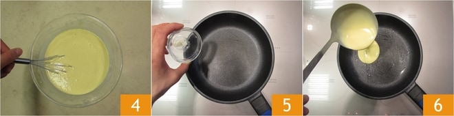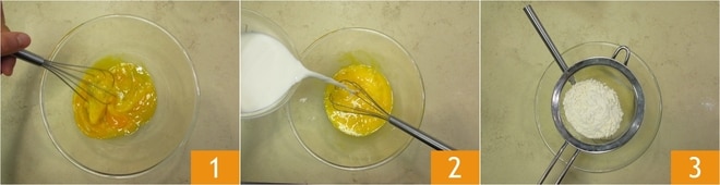 Um die gefüllten Crêpe-Röllchen zuzubereiten, beginnen Sie mit dem Teig: Schlagen Sie das Ei in einer Schüssel 1 mit einer Prise Salz, dann fügen Sie die Milch hinzu 2 und mischen Sie mit dem Schneebesen. Sieben Sie das Mehl in die Schüssel 3.