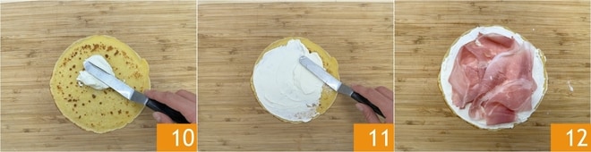 Um die Crêpes zu füllen, legen Sie sie auf das Schneidebrett und verteilen Sie den Philadelphia-Frischkäse gleichmäßig auf der gesamten Oberfläche 10 11. Legen Sie 2 Scheiben gekochten Schinken darauf 12.