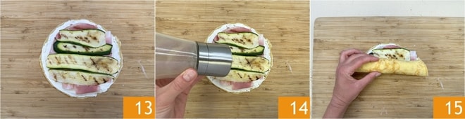 Fügen Sie auch die gegrillten Zucchini hinzu 13 und, wenn Sie möchten, eine Prise schwarzen Pfeffer 14. Rollen Sie die Crêpe vorsichtig auf, indem Sie leicht drücken, um die Füllung gut haften zu lassen 15.