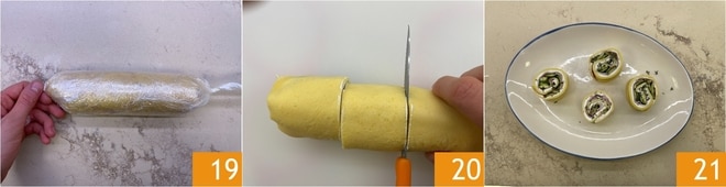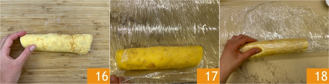Sobald ein Röllchen entstanden ist 16, wickeln Sie es fest in Frischhaltefolie 17 18.