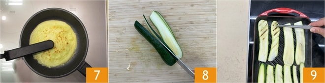 Sobald die Crêpe gekocht ist 7, legen Sie sie auf einen Teller und backen Sie alle weiteren, bis der Teig aufgebraucht ist; mit diesen Mengen sollten Sie 4 Crêpes erhalten. Waschen Sie nun die Zucchini gründlich unter fließendem Wasser, schneiden Sie die Enden ab und schneiden Sie sie der Länge nach in dünne Scheiben von etwa 2-3 mm 8. Erhitzen Sie eine Grillplatte und grillen Sie die Scheiben auf beiden Seiten, bis sie weich und leicht geröstet sind 9, lassen Sie sie dann abkühlen.