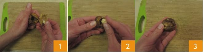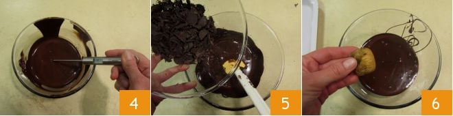 Um die gefüllten, schokoladenüberzogenen Feigen zuzubereiten, beginnen Sie damit, die Rückseite der Feige zu öffnen und mit einem Walnusskern 1, einer Haselnuss 2 oder einer Mandel zu füllen. Schließen Sie sie wieder 3 und fahren Sie so mit allen anderen fort.
