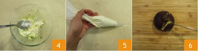 und arbeiten alles mit einem Löffel 4, bis Sie eine glatte Creme erhalten. Geben Sie die Creme in einen Spritzbeutel 5. Schneiden Sie nun ein Kreuz mit dem Messer in die Oberseite der Feigen, um sie in vier Teile zu teilen 6