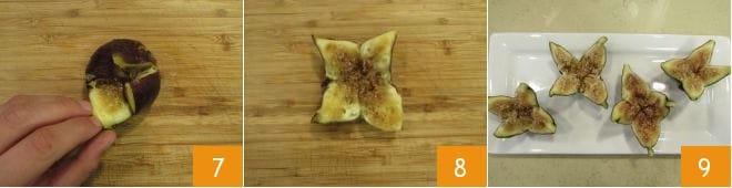 und öffnen Sie sie vorsichtig, als wären sie die Blütenblätter einer Blume (7-8). Platzieren Sie die Feigen auf einem Servierteller 9,