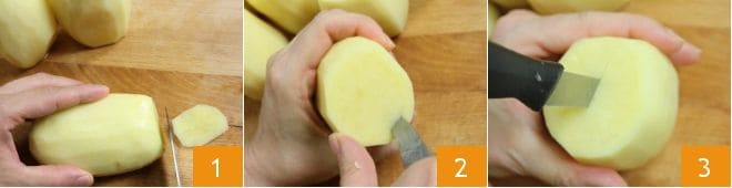 Um die gefüllten Kartoffeln von Oma Franca zuzubereiten, beginnt damit, die Kartoffeln zu schälen. Schneidet dann beide Enden ab 1, damit die Kartoffeln von selbst aufrecht stehen. Danach nehmt ein kleines Messer und schneidet entlang des inneren Umfangs der Kartoffeln, wobei ihr 3-4 Millimeter Rand lasst 2, und schneidet auch in die Mitte des Fruchtfleisches 3, um das Herausnehmen zu erleichtern.