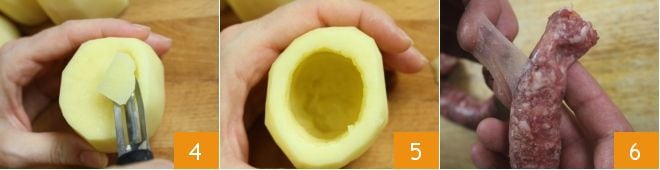 Mit einem kleinen Messer, einem Ausstecher oder einem Sparschäler entfernt ihr das innere Fruchtfleisch 4, ohne jedoch den Boden zu durchbrechen 5. Sobald alle Kartoffeln ausgehöhlt sind, legt sie in eine Schüssel und bedeckt sie mit Wasser, so werden sie nicht braun. Nun widmet euch der Zubereitung der Zutaten für das Ragout: Schneidet die Wurst ein und bröselt sie in eine kleine Schüssel 6.