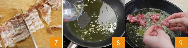 Dann legt den geräucherten Speck auf ein Schneidebrett und schneidet ihn zunächst in Streifen und dann in Würfel 7. Schält eine Knoblauchzehe und hackt sie fein, dann gebt etwas natives Olivenöl extra in eine Pfanne und sobald es heiß ist, lasst den gehackten Knoblauch einige Minuten anbraten, löscht dann mit etwas Wasser oder Gemüsebrühe ab 8. Um zu erfahren, wie man es am besten zubereitet, schaut in unserer Kochschule nach: Gemüsebrühe. Wenn die Flüssigkeit verdampft ist, fügt die gebröselte Wurst hinzu 9.