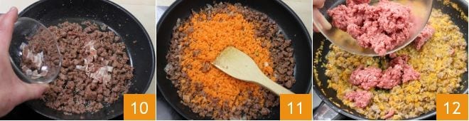 Fügt dann die Speckwürfel hinzu 10 und rührt mit einem Holzlöffel, um das Fleisch gut zu bröseln. Dann fügt ihr das gehackte Karotten- und Frühlingszwiebelgemisch hinzu 11 und lasst es bei mittlerer bis hoher Hitze 5 Minuten kochen. Danach gebt eine Kelle Gemüsebrühe dazu und fügt auch das Hackfleisch hinzu 12.