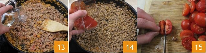 Rührt, um das Fleisch zu bröseln und löscht mit trockenem Weißwein ab. Gebt einen Esslöffel Tomatenmark in eine kleine Schüssel und löst ihn mit etwas Brühe auf, dann fügt ihn zum kochenden Ragout hinzu 14. In der Zwischenzeit schneidet die Kirschtomaten in Viertel 15.