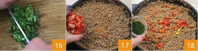 Hackt fein Majoran, Thymian, Rosmarin und Petersilie 16, dann fügt die geviertelten Kirschtomaten und die gehackten Kräuter zum Ragout hinzu (17-18).