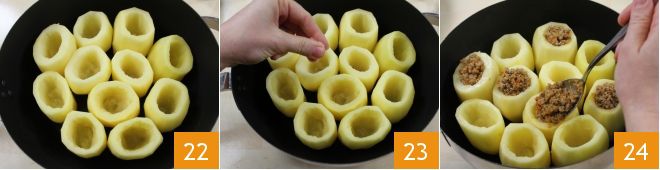 Nun könnt ihr die Kartoffeln abtropfen lassen, trocknet sie mit Küchenpapier und stellt sie nebeneinander in eine breite Pfanne, die auch für den Ofen geeignet ist 22. Salzt sie innen einzeln 23 und füllt sie bis zum Rand mit dem Ragout 24, 2-3 Esslöffel pro Kartoffel sind ausreichend.