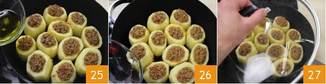 Jetzt müsst ihr nur noch mit dem Kochen fortfahren und die Kartoffeln mit Öl und Gemüsebrühe bis zu einem Drittel ihrer Höhe begießen (25-26). Deckt mit einem Deckel ab 27 und lasst sie 50-60 Minuten lang mit einem kleinen Schlot kochen. Wenn die Kartoffeln zu trocken werden, fügt etwas Gemüsebrühe hinzu. Um einen knusprigeren Effekt zu erzielen, könnt ihr eure gefüllten Kartoffeln nach dem Garen 10 Minuten im Ofen im Grillmodus bei 200° überbacken. Ihr könnt das Gericht auch komplett im vorgeheizten Backofen bei 180° für 90 Minuten kochen. Lasst eure gefüllten Kartoffeln von Oma Franca etwas abkühlen und genießt sie in vollen Zügen!