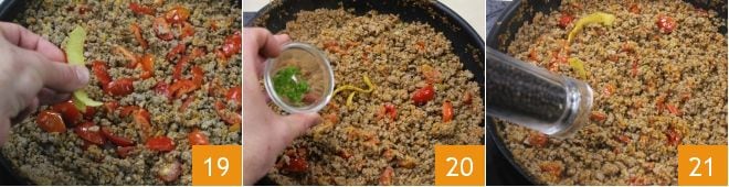 Fügt die Schale einer halben Zitrone 19 und die entkernte und gehackte grüne Chili hinzu 20. Salzt und pfeffert nach Belieben 21 und lasst das Ragout mindestens 30 Minuten kochen. Wenn es eingedickt ist, entfernt die Zitronenschalen und passt es gegebenenfalls mit Salz und Pfeffer an.