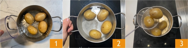 Um die gefüllten Käsekartoffeln zuzubereiten, legt ihr zuerst die gut gewaschenen Kartoffeln in einen Topf und bedeckt sie mit kaltem Wasser 1. Auf den Herd stellen 2 und 30-40 Minuten kochen, bis sie weich sind, dann abgießen 3.<\/p>