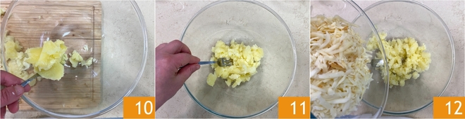 Die ausgehöhlte Kartoffelmasse in eine Schüssel geben 10 und mit einer Gabel zerdrücken 11. Die geriebene Käsemischung hinzufügen 12.<\/p>