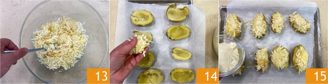 Gut vermischen 13, dann die Kartoffelboote mit der Mischung füllen 14. Alles mit reichlich geriebenem Parmigiano Reggiano bestreuen 15.<\/p>