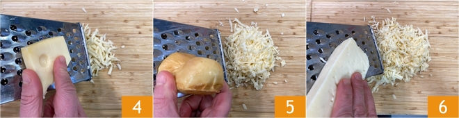 Die 3 Käsesorten mit einer Reibe mit großen Löchern reiben: Gruyère 4, Scamorza 5 und Asiago 6.<\/p>