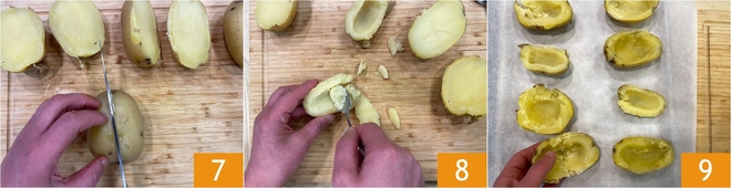 Schneidet die Kartoffeln längs in zwei Hälften 7 und höhlt sie aus 8, um Boote zu formen. Auf ein mit Backpapier ausgelegtes Blech legen 9.<\/p>