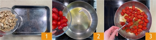 Um die gefüllten marinierten Gurken zuzubereiten, legen Sie als erstes die Erdnüsse auf ein Backblech 1 und rösten Sie sie im statischen Ofen bei 120°C etwa 10 Minuten lang. In der Zwischenzeit gießen Sie das Öl in eine Pfanne, fügen die Kirschtomaten hinzu 2 und rösten Sie sie bei hoher Hitze 10 Minuten lang 3.