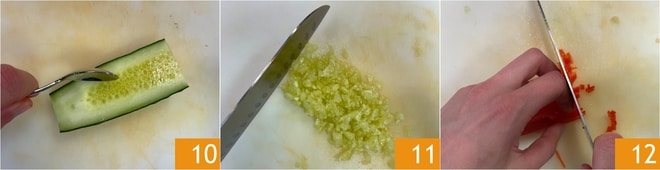 Höhlen Sie die Gurken mit einem Löffel aus 10, hacken Sie das Fruchtfleisch mit einem Messer klein 11 und geben Sie es in eine Schüssel. Entfernen Sie nun die Samen und inneren Fasern der Paprika, schneiden Sie sie zuerst in Streifen und dann in Würfel 12.