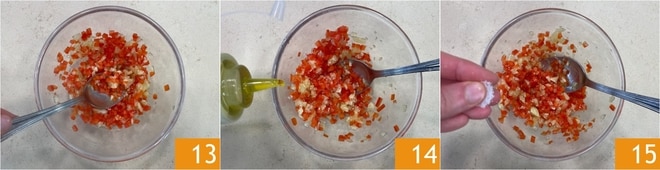 Fügen Sie die Paprika zum Gurkenfruchtfleisch hinzu 13, würzen Sie mit Öl 14 und Salz 15.
