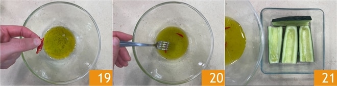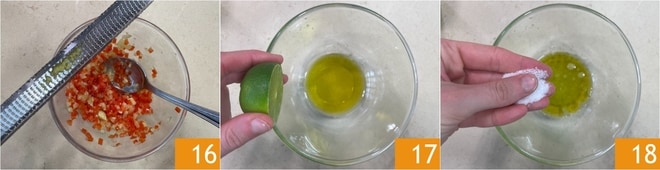 Aromatisieren Sie mit dem geriebenen Ingwer 16, mischen Sie und stellen Sie es beiseite. Für die Marinade der Gurken geben Sie Öl, Limettensaft 17, Salz, Pfeffer und Zucker 18 in eine Schüssel.