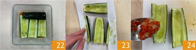 Lassen Sie es 30 Minuten im Kühlschrank marinieren 22. Nach der Marinierzeit legen Sie die Gurken auf ein saugfähiges Papier und tupfen sie vorsichtig ab 23. Füllen Sie sie dann mit der Füllung 24 und garnieren Sie mit gehacktem Schnittlauch.