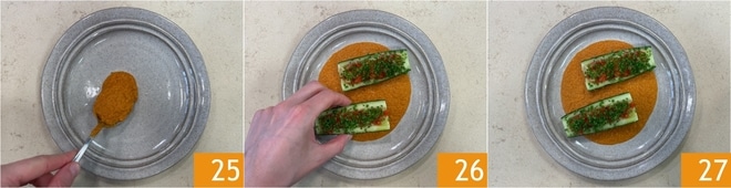 Richten Sie an, indem Sie auf dem Tellerboden die Erdnuss-Tomatensauce verteilen 25, dann die Gurken darauflegen 26. Ihre gefüllten marinierten Gurken sind bereit zum Servieren 27!
