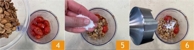 Geben Sie die Tomaten und Erdnüsse in einen hohen Behälter 4, würzen Sie mit Salz 5 und pürieren Sie sie mit einem Stabmixer 6.