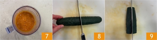 Sie sollten eine homogene Sauce erhalten 7. Beiseite stellen und sich den Gurken widmen: Entfernen Sie die Enden der Gurken und halbieren Sie sie 8, dann erneut längs halbieren 9.