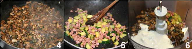 Am Ende der Garzeit die gehackte Petersilie hinzufügen und salzen 4. In der Zwischenzeit die Béchamelsauce mit den in diesem Rezept angegebenen Mengen zubereiten. In einem anderen Topf die Schinkenwürfel mit den in Stücke geschnittenen Zucchini und zwei Esslöffeln Öl anbraten, bis die Zucchini weich geworden sind 5. In einem Mixer die Pilze (bis auf 3-4 Esslöffel, die beiseitegelegt werden), die Zucchini, den Schinken, die Hälfte der Béchamelsauce, 50 g Grana Padano und 50 g geriebenen Pecorino geben; auf der niedrigsten Geschwindigkeit für sehr wenige Augenblicke mixen,