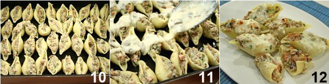und sie nebeneinander in eine geölte Auflaufform legen 10; die gesamte Auflaufform mit den gefüllten Muschelnudeln füllen, dann die beiseitegelegten Pilze mit der restlichen Béchamelsauce vermengen (falls sie zu fest geworden ist, einige Esslöffel Milch hinzufügen, um sie flüssiger zu machen) und die Muschelnudeln mit der erhaltenen Béchamel-Pilz-Creme überziehen 11, dann mit dem restlichen geriebenen Grana Padano bestreuen und einige Minuten unter den Grill im Ofen stellen, gerade genug Zeit, um eine schöne goldene Kruste zu erhalten (etwa 10 Minuten). Die gefüllten Muschelnudeln sofort servieren 12.