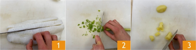 Um die gefüllten Paccheri mit Kabeljau auf Käsefondue zuzubereiten, beginnen Sie mit der Reinigung des Fisches: Legen Sie den entsalzten Kabeljau auf ein Schneidebrett und entfernen Sie vorsichtig die Haut mithilfe eines scharfen Messers. Entfernen Sie eventuelle Gräten mit einer Pinzette, dann schneiden Sie den Kabeljau zuerst in Streifen 1 und dann in gleichmäßige Würfel. Reinigen Sie die Frühlingszwiebel, indem Sie die Basis und den härteren grünen Teil entfernen, dann schneiden Sie sie in dünne Ringe 2. Schälen Sie die Kartoffeln und schneiden Sie sie in Würfel 3.